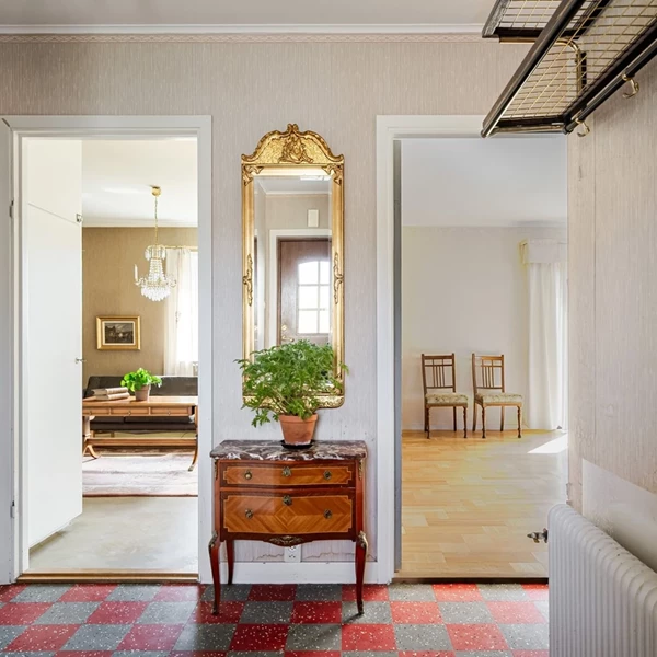 Välkommnade entré med vackra pelare till hallen med plats för avhängning och här möts du av en härlig rymd från de tre rummen som ligger i fil med utsikt över öppna fält och med viss sjöutsikt. I anslutning till entréhallen fins ett ljust helkaklat duschrum med wc, tvättställskommod med spegelskåp, duschplats med glasväggar och elektrisk handdukstork (2018). Vidare in i huset ligger köket med bra arbetsytor och matplats intill. Vitvaror såsom spis, spisfläkt, diskmaskin, kyl/frys samt kaklat ovan disk- arbetsbänk. Intill köket finns ett ljust rum som idag nyttjas till matsal som likväl kan nyttjas till sovrum. Vidare finns ett rymligt sällskapsrum med plats för soffgrupp och sist men inte minst så ligger vardagsrummet med original skjutdörrar och med utgång till en solig balkong. Härifrån har du sjöglimt och en fri vy över den egna tomten och det vackra landskapet.