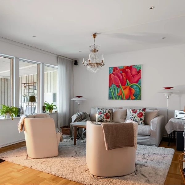 Rymligt vardagsrum som bjuder in till umgänge och avkoppling. Värmande braskamin som inte bara ger värme utan höjer mysfaktorn ytterligare. Härifrån nås den insynsskyddade och stora altanen som är tillbyggd. En perfekt plats för sommarkvällar, lek och lugna stunder. På nedre plan finns även gästtoalett, tvättstuga och ett förråd.