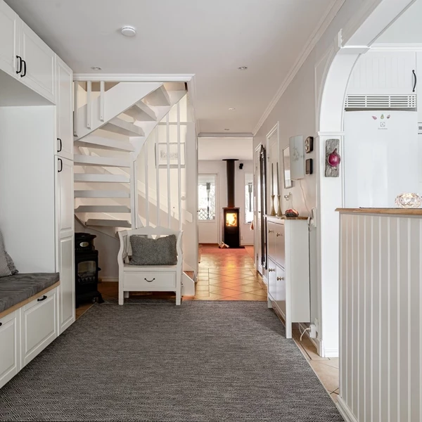 Entré via takad farstukvist till välkomnande hall med gott om plats för avhängning och förvaring. Klinkergolv med golvvärme och platsbyggd sittmöbel med infälld belysning och förvaring.