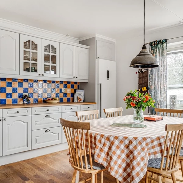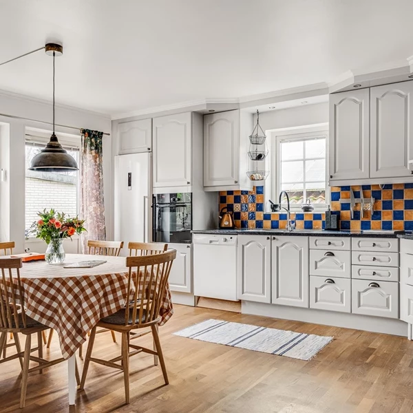 Entré sker via takad farstukvist till en välkomnande hall med klinkergolv och goda förvaringsmöjligheter i garderobsvägg. I anslutning finns helkaklad gästtoalett. Vidare öppnar bostaden upp sig mot ett ljust och inbjudande vardagsrum med fönster i tre väderstreck, furugolv och en vacker grön kamin som bidrar till både värme och atmosfär. Det rymliga köket erbjuder gott om arbetsytor och förvaring samt plats för större matbord. Maskinell utrustning såsom kombinationshäll med gas och induktion, fläktkåpa, integrerad diskmaskin samt kyl och frys i fullhöjd. Bänkskivor genomgående av natursten (granit) som är både värme- och reptålig. Från köket nås den generösa altanen i soligt läge – en naturlig plats för både vardag och umgänge. Totalrenoverat duschrum (-19) med helkaklade väggar och klinkergolv med golvvärme. Duschplats med glasväggar, wc, tvättställskommod och handdukstork (el). Tvättstugan är helkaklad med tvättmaskin, torktumlare, rostfri och med praktisk grovingång.