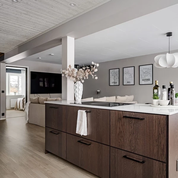 Entréplanet rymmer två rymliga sovrum, ett stilrent nyrenoverat duschrum (2024) samt praktisk tvättstuga med förvaring, rostfri ho, arbetbänk samt nyare tvättmaskin och torktumlare. Det totalrenoverade och ombyggda köket är hemmets naturliga samlingspunkt, modernt och smakfullt inrett med köksluckor i valnöt, slitstarka bänkskivor i kompositsten samt en köksö i husets mitt med integrerad induktionshäll med smart inbyggd fläkt. Inbyggnadsugn och micro i högskåp, vinkyl och gott om förvaring och arbetsyta. Större matbord ryms enkelt och stora fönsterpartier skapar ett härligt ljusinsläpp och täljstenskaminen bidrar med både värme och trivsel. Från det möblerbara vardagsrummet nås den trädäckade altanen med gott om plats för utemöbler, grill och sociala tillställningar.
