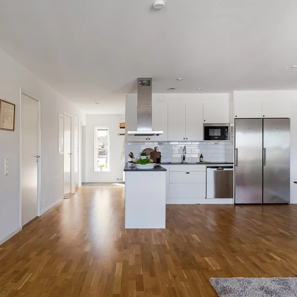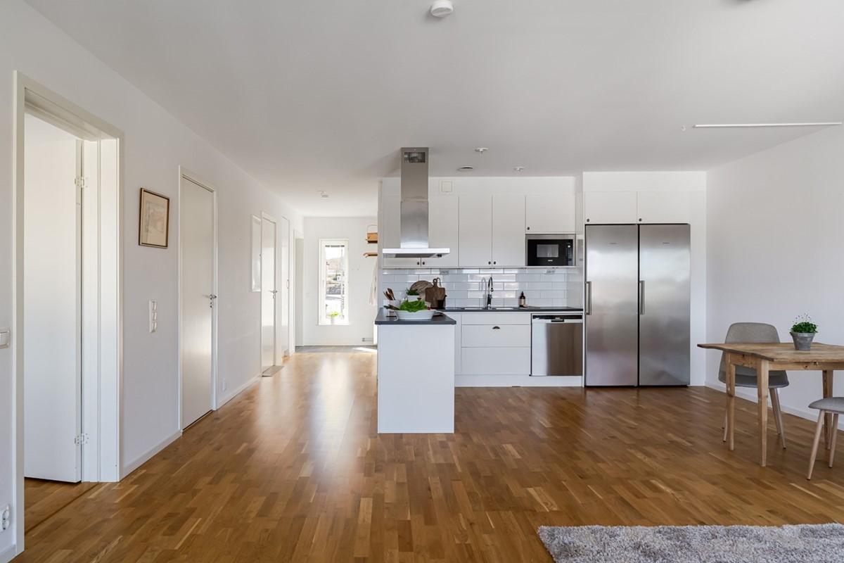Kök och vardagsrum i social öppen planlösning med gott om plats för större soffmöblemang och matbord. Fullutrustat Ballingslöv med vita släta skåpsluckor och rostfria vitvaror från Siemens. Två bra sovrum varav det större med garderobsvägg. Rymligt duschrum med helkaklade väggar och klinkergolv med golvvärme. Förråd/klädkammare med gott om förvaring och ett ytterligare förråd finns i källarplanet. Ingång till lägenheten sker via loftgång i söderläge, detta gör att du kan njuta av solen från morgon till kväll! Rummen har genomgående ekparkettgolv samt målade väggar och tak. Gemensam trevlig innergård med planteringar och utemöbler för de boende att nyttja.