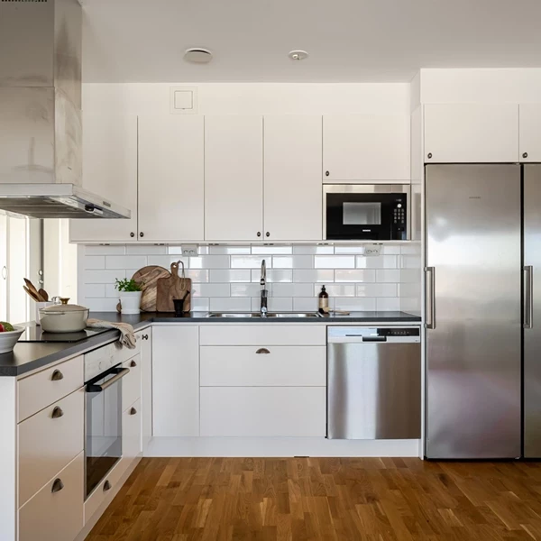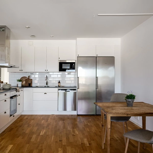 Trivsamt och öppet med kök, matplats och vardagsrum i öppen planlösning med utgång till bostadens härliga balkong med sjöutsikt. Här får du plats med större soffgrupp, mediamöbel och matbord. Köket har bra om skåpsförvaring och goda arbetsytor. Vita släta skåpsluckor från Ballingslöv, bänkskiva av laminat samt vitt väggkakel ovan disk- arbetsbänk. Den maskinella rostfria utrustningen från Siemens består av: