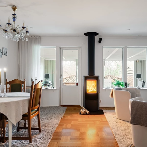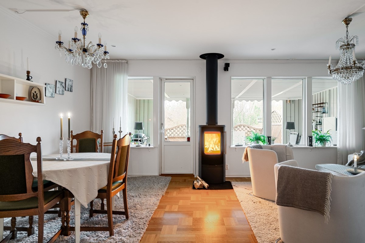 Rymligt vardagsrum som bjuder in till umgänge och avkoppling. Värmande braskamin som inte bara ger värme utan höjer mysfaktorn ytterligare. Härifrån nås den insynsskyddade och stora altanen som är tillbyggd. En perfekt plats för sommarkvällar, lek och lugna stunder. På nedre plan finns även gästtoalett, tvättstuga och ett förråd.